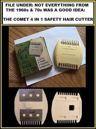 The Comet 4 IN 1 was a do-it-yourself hair cutting gizmo: plastic; roughly 3 inches by 4 inches (including comb teeth); with razor-type cutting blades within. It boasted that it: cuts; trims; grooms; removes [hair]…