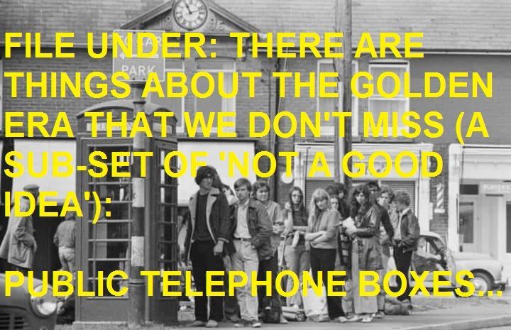 (Footnote / qualifier: As always with these kind of articles, I acknowledge that some folks are / were fond of the items that I'm having a bit of playful fun with; and besides, items like old phone boxes were part of the background / fixtures and fittings of this era, so in that way I too have a certain nostalgic fondness for them. )