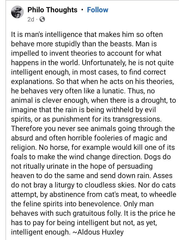 The modern day social media 'educated' person will read this Aldous Huxley excerpt and think 'Yep. That's religion alright. It's exactly that. Oh how it's held us back...' Blah-blah-blah' - yaketty-yak-yak...