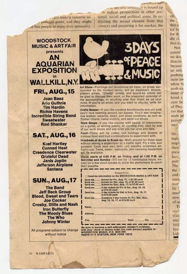 1969: AN ADVERT FOR THE MUSIC AND WOODSTOCK ARTS FESTIVAL...
