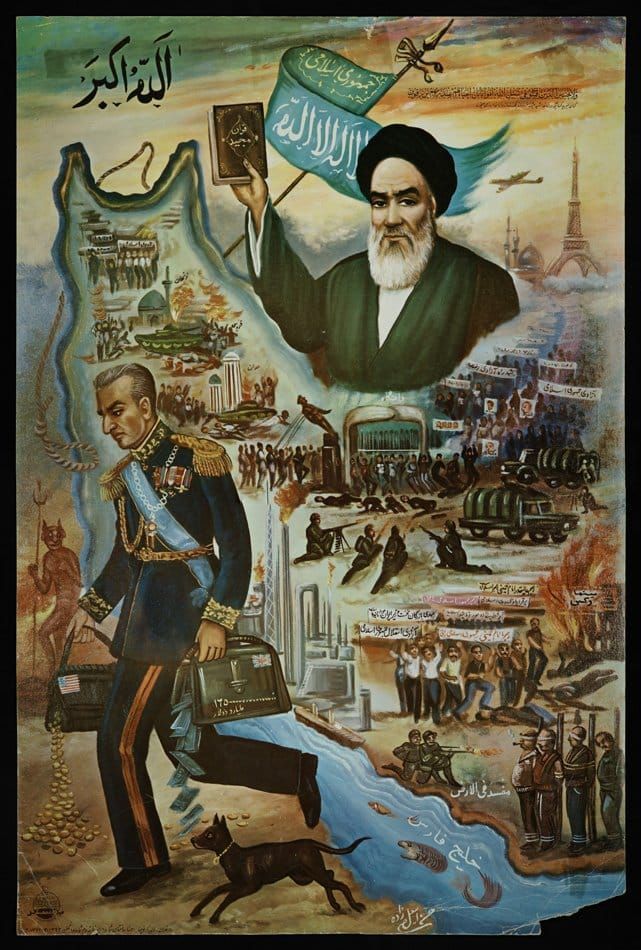 '...Imitating the traditional Iranian “coffee-house” paintings used for picture storytelling, this poster illustrates Mohammad Reza Shah’s exile from Iran, marking the end of the Revolution and Ayatollah Khomeini’s return. Hurrying past a noose, the Shah flees across the Persian Gulf towards Egypt, accompanied by a black dog and red devil. Cash and gold coins tumble out of his luggage stamped with American and British flags. In the upper right, the Ayatollah, holding a Qur’an, hovers above the demonstrations and executions that took place during the Revolution. In the background, the Eiffel Tower and the Najaf Shrine remind the viewer of Khomeini’s exile in Iraq and France prior to his triumphant return to Iran...'