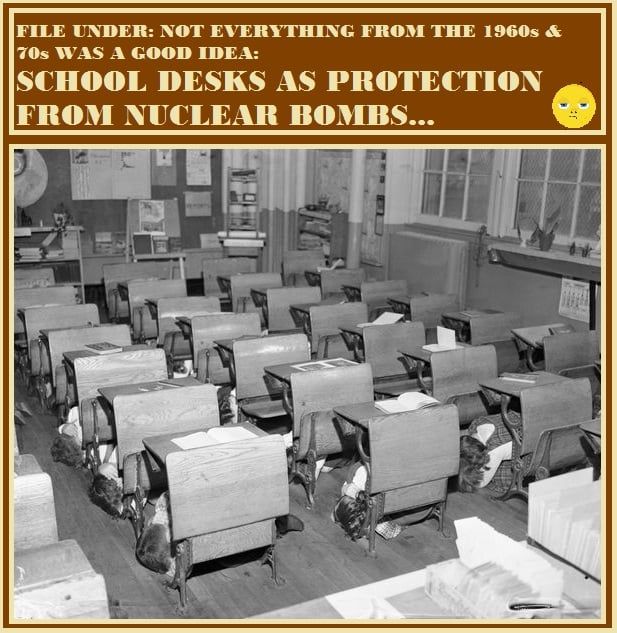Yes, I will repeat that - for those of younger generations who may not actually believe this: this was part of a USA and Canada training exercise for school kids, in which they were assured that they'd stand a pre-tty good chance of surviving several megatons of nuclear bomb blast - and the searing heat - and the radiation that followed, by hiding under their desks at school...