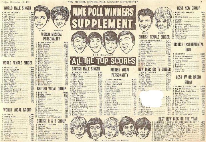 Well now - what / who was winning readers' polls (well at least the prestigious New Musical Express, UK music paper poll) in the UK at the end of the year that revolutionised modern musical culture: the year of 'The British Invasion' phenomenon: the sudden and massive popularity of British bands and artists in North America and worldwide...? 🤔