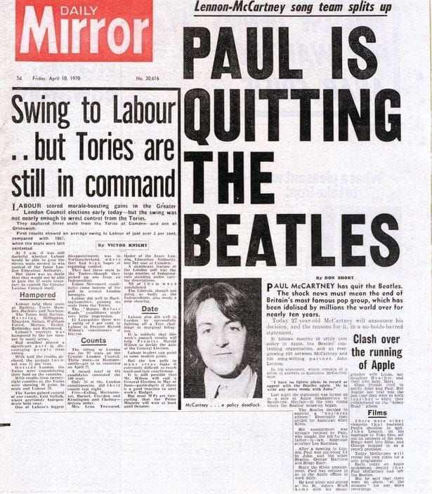 1970: APRIL 10th. THE BEATLES' SPLIT (AT THIS STAGE, ANNOUNCED AS PAUL MCCARTNEY QUITTING THE BAND) IS UK FRONT PAGE NEWS...