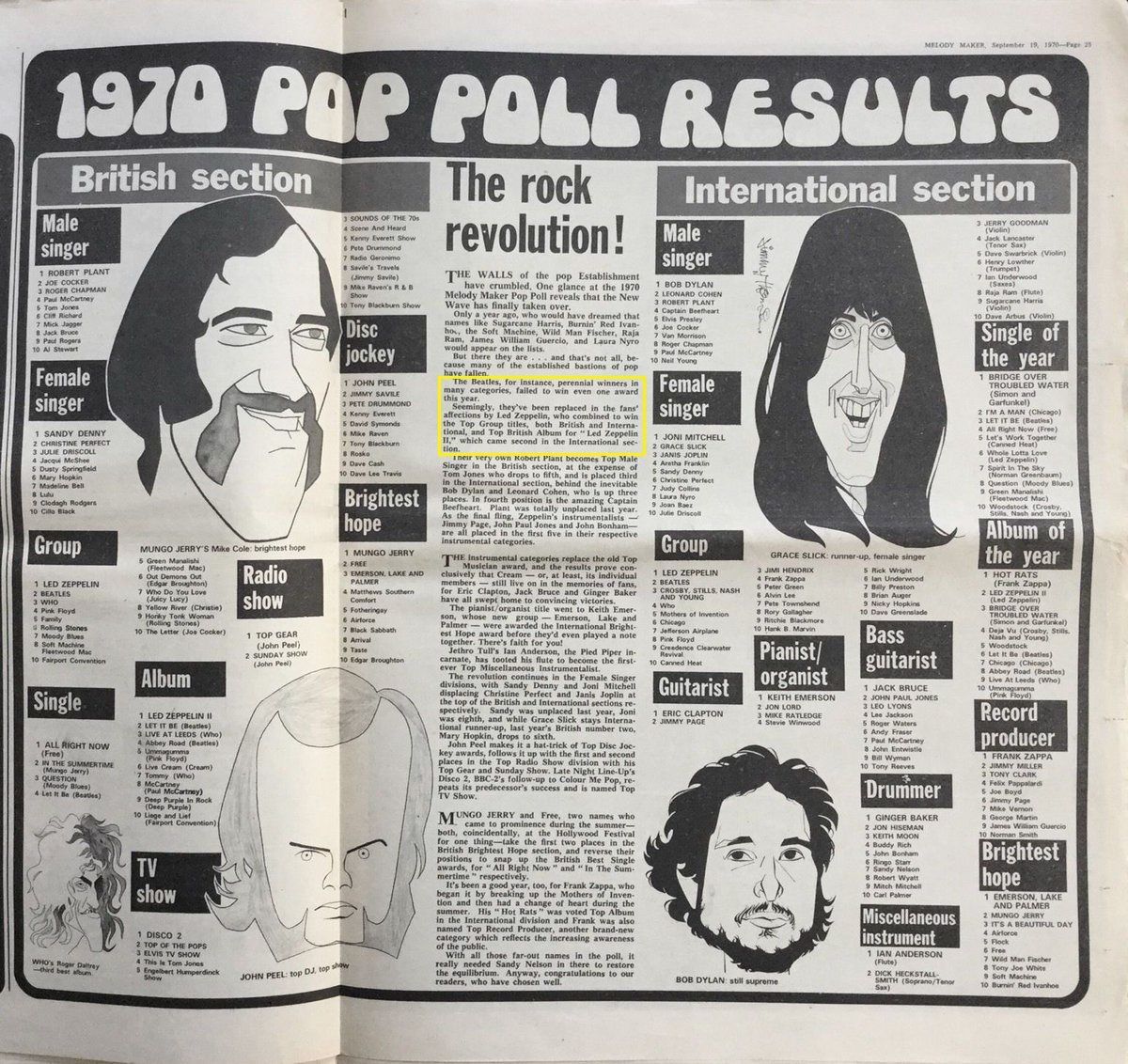 In the year of the last Beatles studio album, 'Let It Be', The Beatles were usurped as top band by the the band that was to go on rule the 1970s: Led Zeppelin. I've picked out a section of the central text (by highlighting it in a yellow box), where the Melody Maker journo agrees with this development.